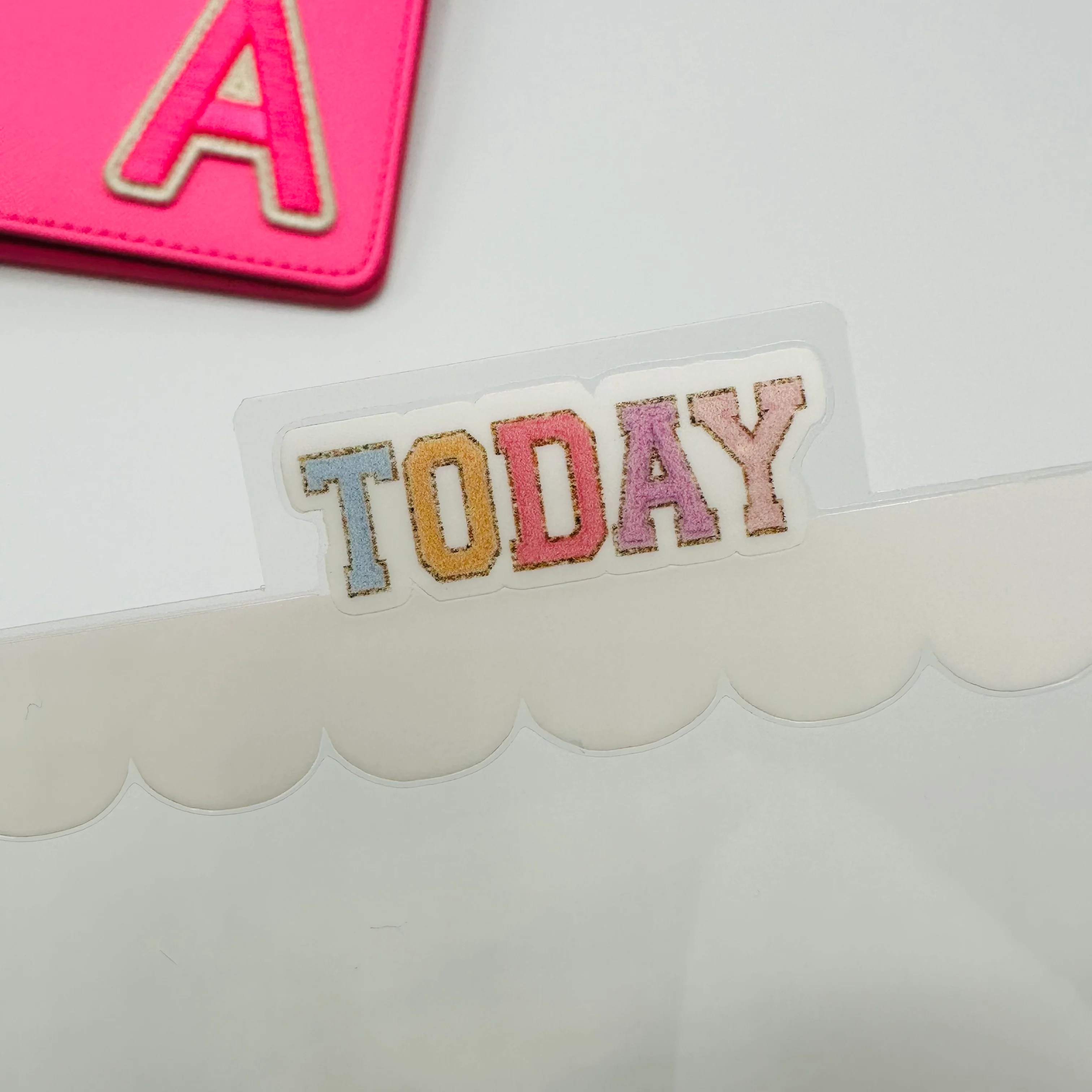 Set of 5 SIDEĀ TAB planner dividers with a skinny scallopĀ border. Customize with your choice of words that will appear in a colorful realistic varsity letter font as the tab.