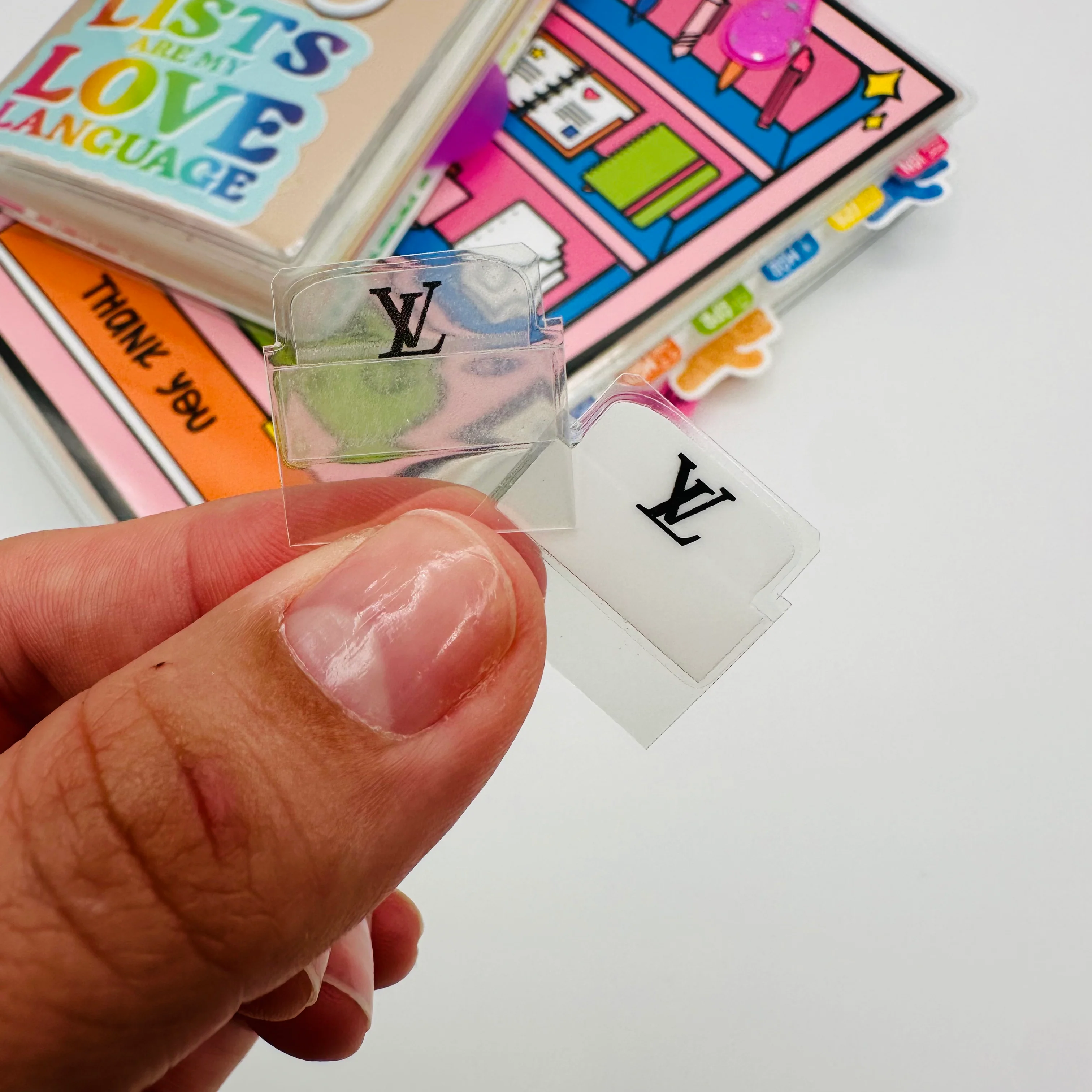 Set of (6) SUPER Mini monthly tab planner dividers with a different Luxe logo on each – compatible with almost all planner styles and sizes. Choose from clear or matte white sticker paper with your own background color as well as the color of the logo.